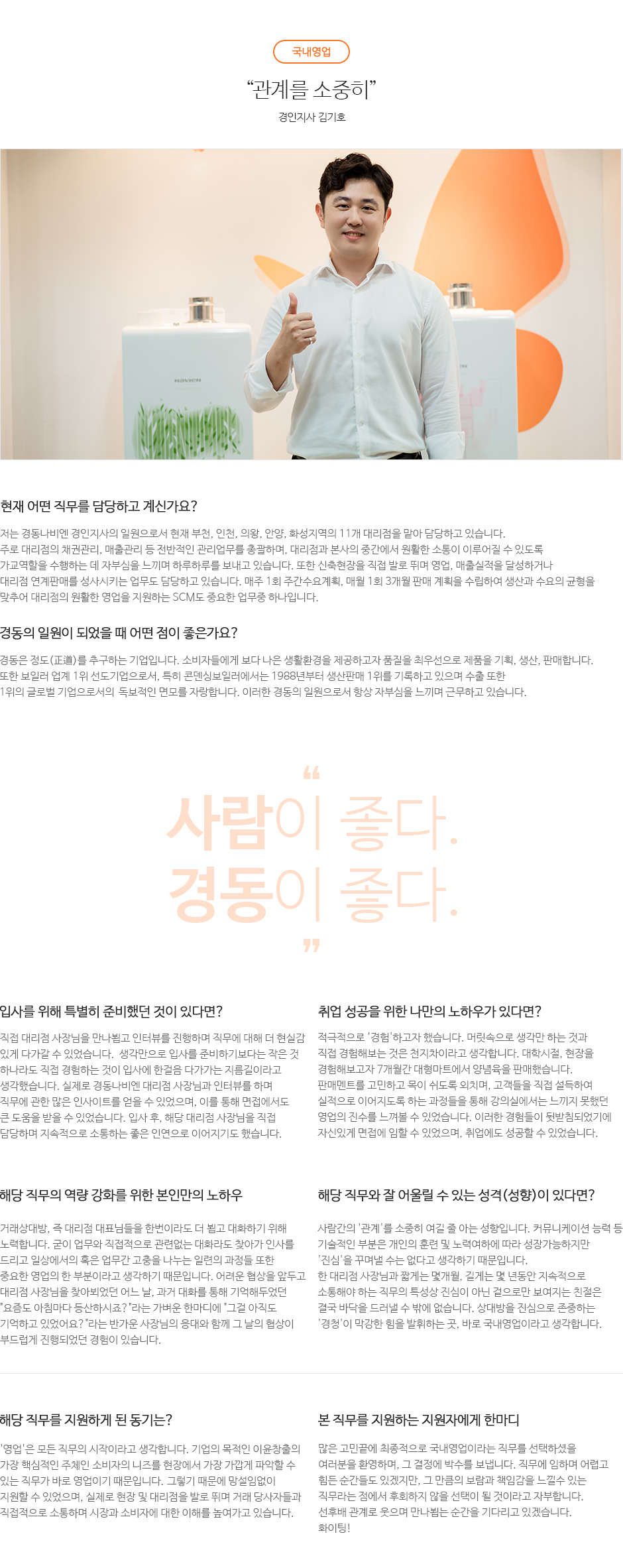 국내영업 직무는 당사의 파트너인 대리점을 관리하는 직무로 개설부터 해지까지 대리점과 관련된 모든 업무를 수행합니다. 매출 증대 및 M/S 확대를 목적으로, 본사와 대리점의 중간에서 커뮤니케이션을 담당하며 대리점 운영에 차질이 없도록 다양한 방면에서 지원활동을 전개합니다. 세부적으로는 신규 대리점 발굴, 기존 대리점 해지, 채권관리, 기술 지원, 각종 제도 고안 및 교육, 시장 및 경쟁사 정보 파악 등 다양한 업무를 처리합니다. 기본적으로 사람을 대하는 업무이다보니 원만한 대인관계를 유지할 수 있어야 하며 효과적인 커뮤니케이션 능력 및 적극적인 태도 역시 중요합니다. 국내영업에서 지속적으로 성장하다 보면 제품과 기술은 물론 유통에 대한 감각이 생겨 경영자로 발돋움 하는데 큰 도움이 됩니다.