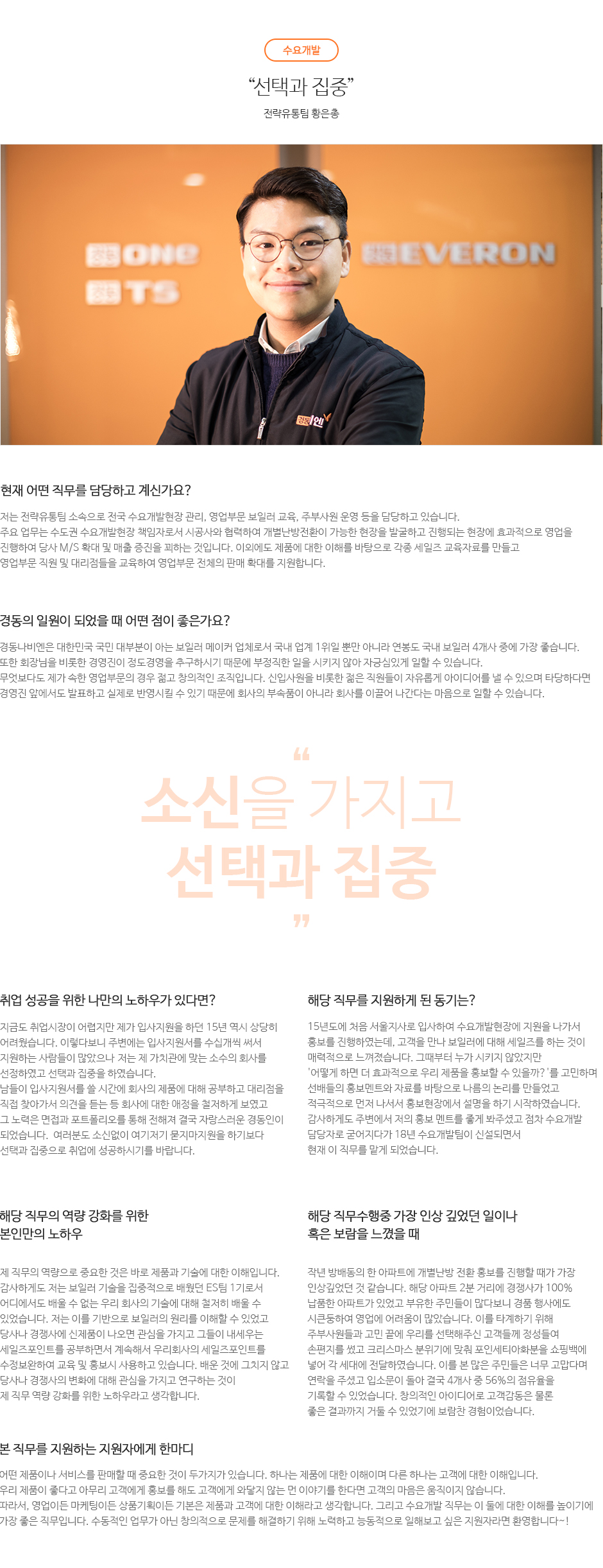 제품개발에서부터 판매까지 연결되는 회사 전반적인 방향성과 전략을 이해함으로써 영업과 마케팅을 아우르는 전략적 영업전문가로 성장이 가능합니다. 소비자와 직접 대면영업을 실시하기 때문에 소비자의 눈높이에 맞게 당사 보일러에 대한 특장점을 이해하기 쉽게 설명하고 계약으로 유도하는 영업으로 영업에 가장 기초가 되는 것으로 차후 본인의 자기계발과 영업에 관련된 업무를 할때 기초가 튼튼하게 되고 역량강화가 가능합니다. 당사의 제품 기술 및 마케팅 전략에 대한 이해를 통해 영업/마케팅/전략 기획 등 다양한 업무로의 커리어 개발이 가능합니다.