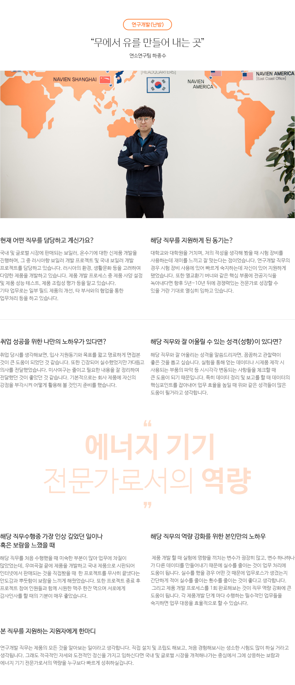 난방기기 연구개발 직무는 국내 및 글로벌 시장의 요구사항에 부합하는 신제품 개발을 최일선에서 담당하는 직무입니다. 이를 위하여 국내·외 설치조건, 환경 법규 규제 및 정책변화를 분석하며 시장의 요구사항, 경쟁사 분석, 과거 문제 개선을 통한 신제품 구상 업무를 수행합니다. 이후 세부업무는 열교환기 버너 등 주요 핵심부품의 선행개발, 주요 부품에 대한 제품화 과정을 통하여 성능, 내구, 기능에 대한 기본성능시험을 수행하며 최종적으로 국내외 각 국가의 법규인증 업무를 담당합니다. 하나의 신제품 개발을 위해서는 회사의 모든 부서가 연관을 가지고 진행되며 특히 제품 연구개발 직무는 기획부터 양산까지 개발 전 과정에 참여하게 되어 특정분야 전문가로써의 능력뿐만 아니라 개발과정 전체를 볼 수 있는 포괄적 지식을 가진 엔지니어로써의 역량이 필요합니다.