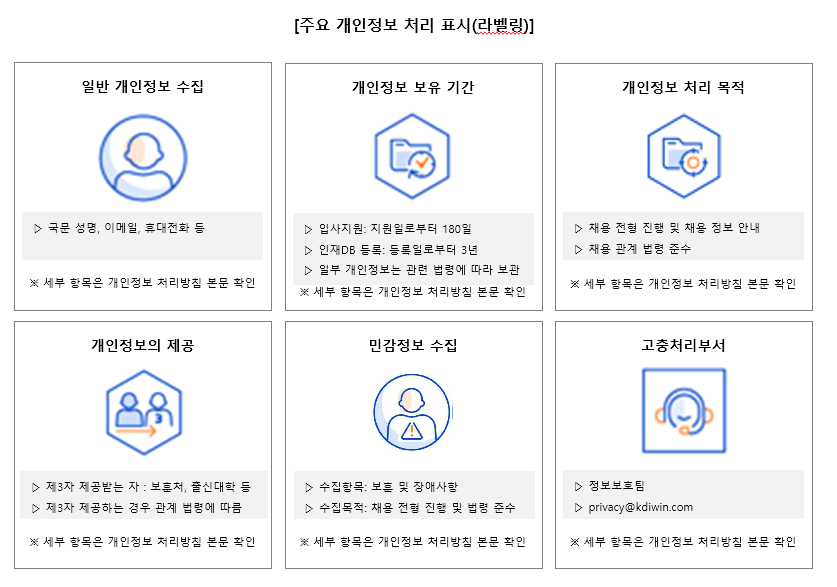 * 목적: 인재풀 등록, 채용 전형 진행, 채용 진행 단계별 결과 등 채용 정보 안내 및 채용 관계 법령 준수